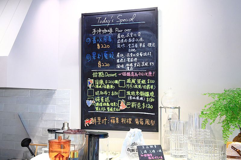 門口放置一個小黑板,推出鮮花與永生花,以及不定期植栽課程,簡單介紹販售的餐點,充滿鄉村風氛圍的小店。