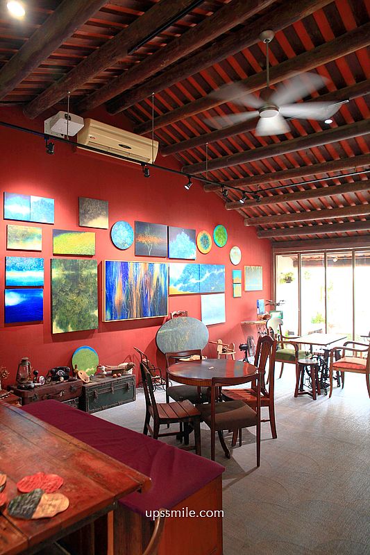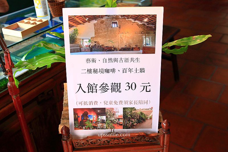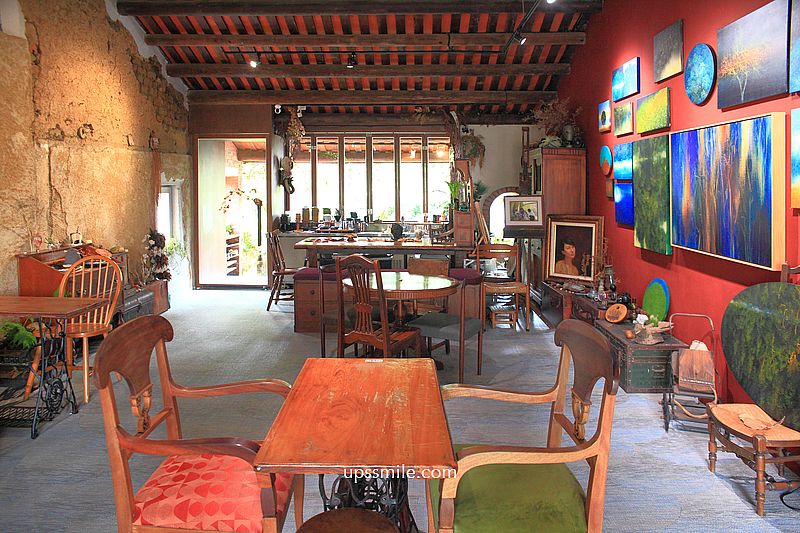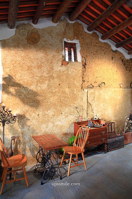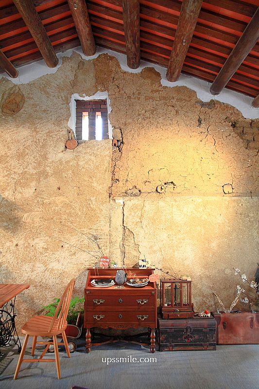 二樓傳統老宅,三角屋頂,這裡原是吳冠德老師的畫室,因常需要煮咖啡招待來看畫的朋友,有了這咖啡廳,門票在這裡還可全額抵消費,透露出百年土牆老宅建築,斑駁痕跡,二樓咖啡廳,老宅復古風氛圍,橫掃IG網美打卡景點。