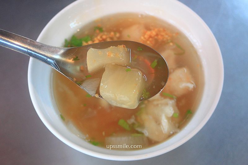 綜合羹湯100元,或許會覺得這一碗要價真不便宜,但整碗配料豐富,湯頭喝起來帶點勾芡,裡頭有花枝羹、蝦仁羹等配料,花枝只有裹上薄薄的粉漿,花枝羹肉厚,一整大原塊花枝羹,紮實Q彈,鮮美口感,好銷魂。