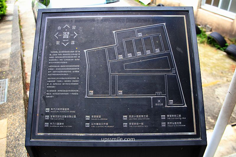 門口有個立牌,詳細介紹,合習聚落是甘樂文創在三峽經營的工藝&產業實踐基地,「共同學習」是合習聚落的核心精神。合習空間有禾乃川國產豆製所、禾乃川釀酵坊、青草教室、三藝金工、玩皮小孩皮革工坊等。