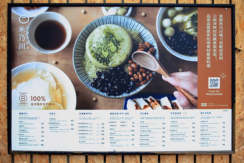 新北美食地圖,台北老街好好玩,三峽老街美食,三峽甜品推薦,禾乃川國產豆製所位於新北市三峽區民權街84巷12-1號,隱身三峽巷弄裡的手工豆腐坊,愛鄰老醫院轉型的合習聚落,現是豆製品專賣店,嚴選國產契作,用台灣非基改黃豆,堅持無添加,取得無添加認證與產銷履歷、HACCP食品安全驗證,更堅持不加化學消泡劑與防腐劑,可吃的安心,採用臺灣日曬鹽鹵製作最天然豆製品,提供販售豆漿、豆干、豆腐、豆皮等,還有創意豆漿、味噌霜淇淋、豆腐冰等製作最天然的豆製品,點了碧螺春抹綠豆腐冰90元,嚴選三峽特有碧螺春製作豆腐奶酪,茶香四溢,台版宇治抹茶,三峽下午茶,三峽豆花推薦,附禾乃川國產豆製所菜單。