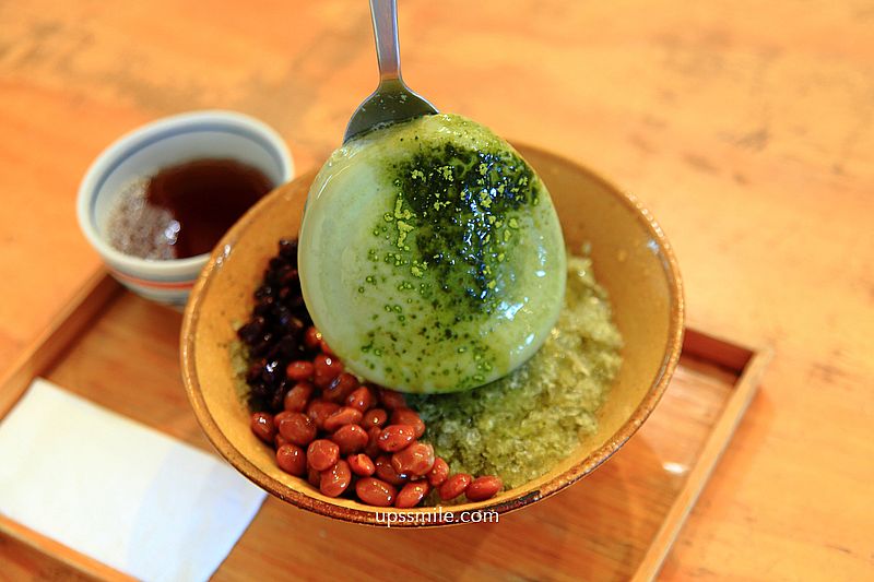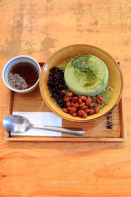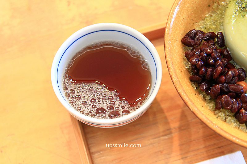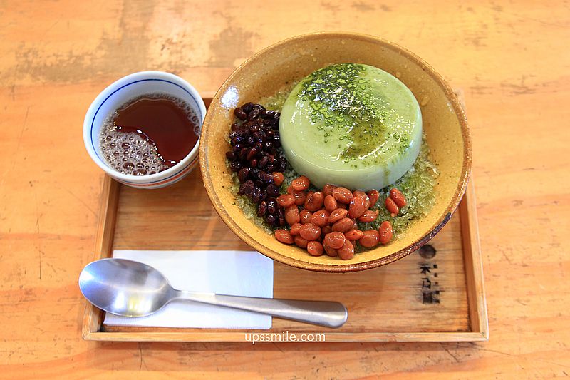 碧螺春抹綠豆腐冰90元,嚴選三峽特有碧螺春製作豆腐奶酪,茶香四溢,台版的宇治抹茶,配料有蜜黃、黑豆,一旁附設一杯茶,用木盤裝好冰上桌,很日式文青風擺盤,很誘人。