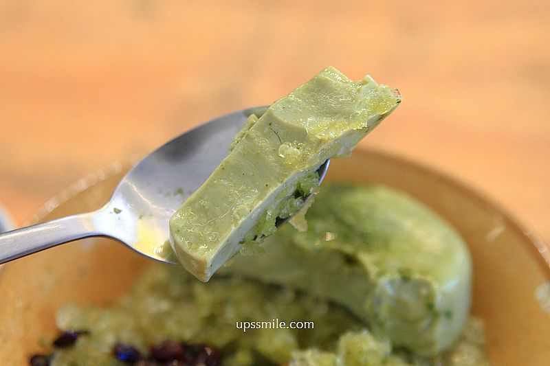 豆腐奶酪,豆味十足的抹茶奶酪,口感軟Q,適合牙口不好的長輩與親子小孩,奶酪口感,加入蜜黃、黑豆,吃起來脆脆的口感,很特別,每口都是滿足,炎炎夏日,吃碗冰搭配豆製品,好不賴。