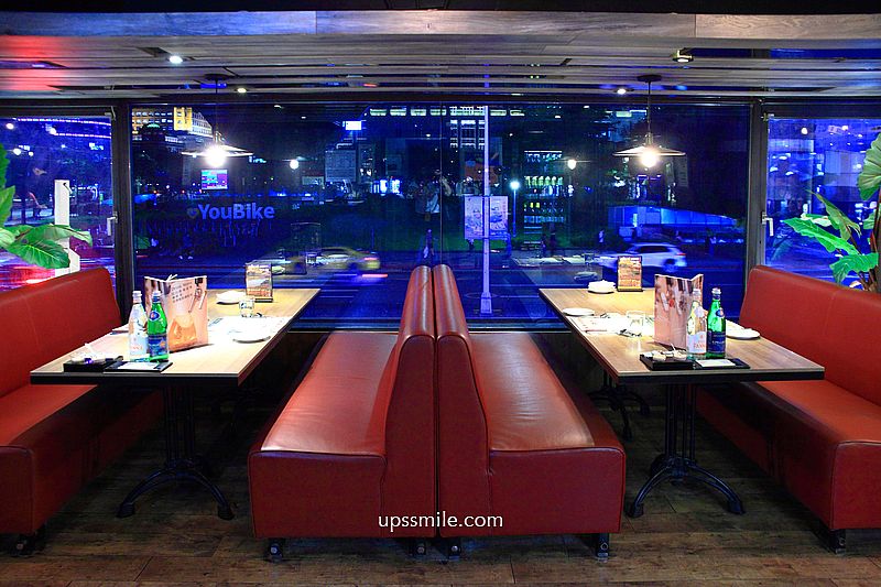 台北信義區窗邊景觀位置,有低消5000元消費限制,半開放式皮革座位,可看信義區街邊風景,每桌用餐時間為2小時。