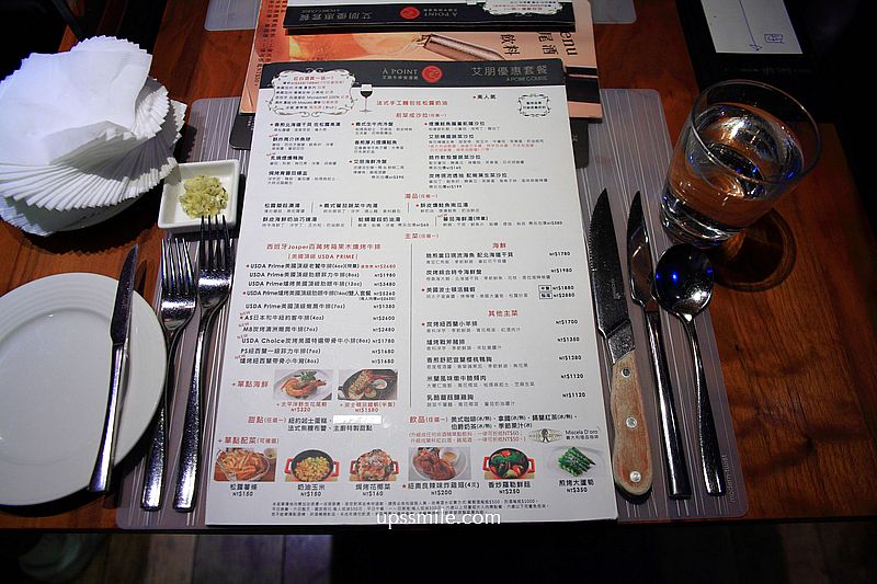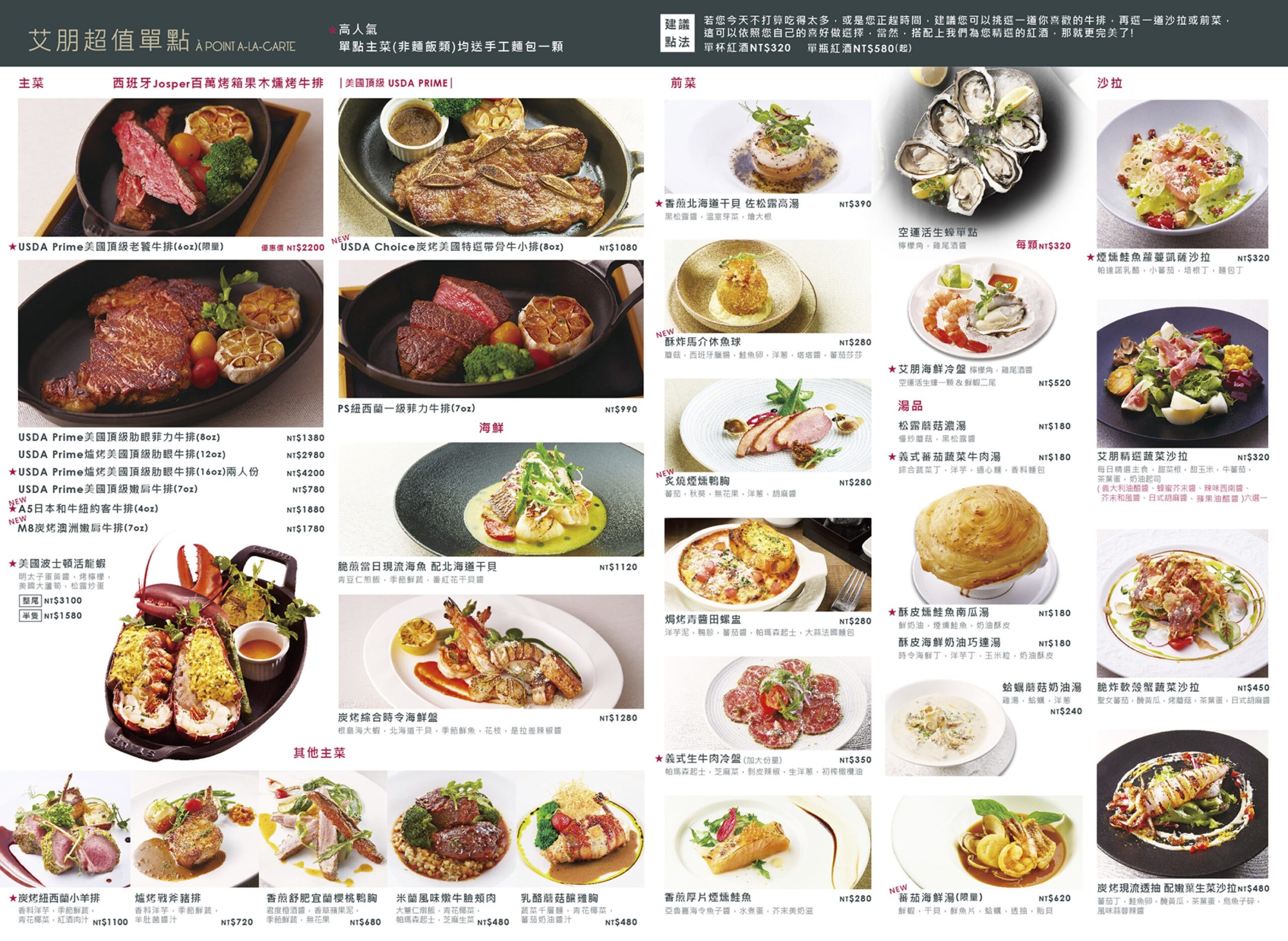 艾朋牛排餐酒館菜單,菜單一整大張,線上菜單,推出套餐組合,這天吃晚餐套餐線上菜單,雞豬牛羊通通有,還有愛吃波士頓龍蝦老饕,可點起來,艾朋牛排餐酒館生日優惠,看身分證,可打折,但建議不要加點龍蝦,雖龍蝦有買半隻送大隻優惠,但享用方案,壽星就不能優惠折扣了,變得很不高cp,這裡牛排走中高價位,屬於台北中價位牛排。