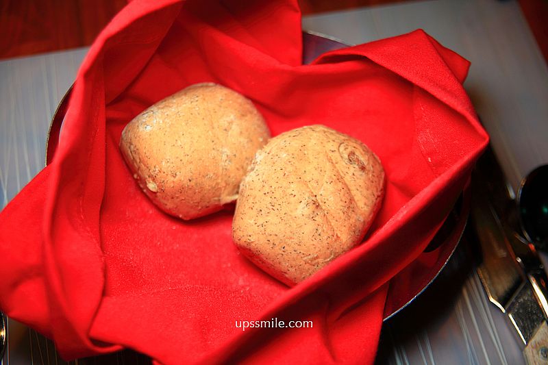 法式手工麵包佐松露奶油,可免費再續一次,麵包走軟法麵包口感,全麥核桃麵包,上桌麵包烤過有麥香,塗抹松露奶油,松露香氣獨特誘人,麵包軟嫩好入口,不乾柴。