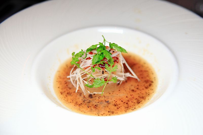 前菜或沙拉選一,香煎北海道干貝佐松露高湯,使用黑松露醬汁在底,上頭煎過飽滿大顆的干貝,非常脆甜,搭配溫室芽菜與大根,小巧精緻,濃郁松露香氣撲鼻而來。