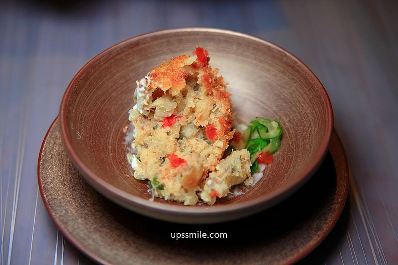 前菜或沙拉選一,酥炸馬介休魚球,用蘑菇、西班牙臘腸、鮭魚卵、洋蔥,製作成一球,炸過後成金黃色澤,下方用塔塔醬與番茄莎莎,脆口開胃,酥酥外衣,內鮭魚卵鹹香,洋蔥的甜感,很有層次。