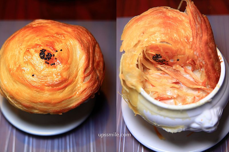 烤到酥脆酥皮,輕輕一弄,酥皮酥脆到一直掉下屑屑,弄到湯中,搭配濃湯喝,濃郁厚實奶香,海鮮丁與玉米粒,非常奶香,不奶膩,浸泡過的酥皮,吸附湯汁,帶點濕潤軟綿口感,每口是滿足。