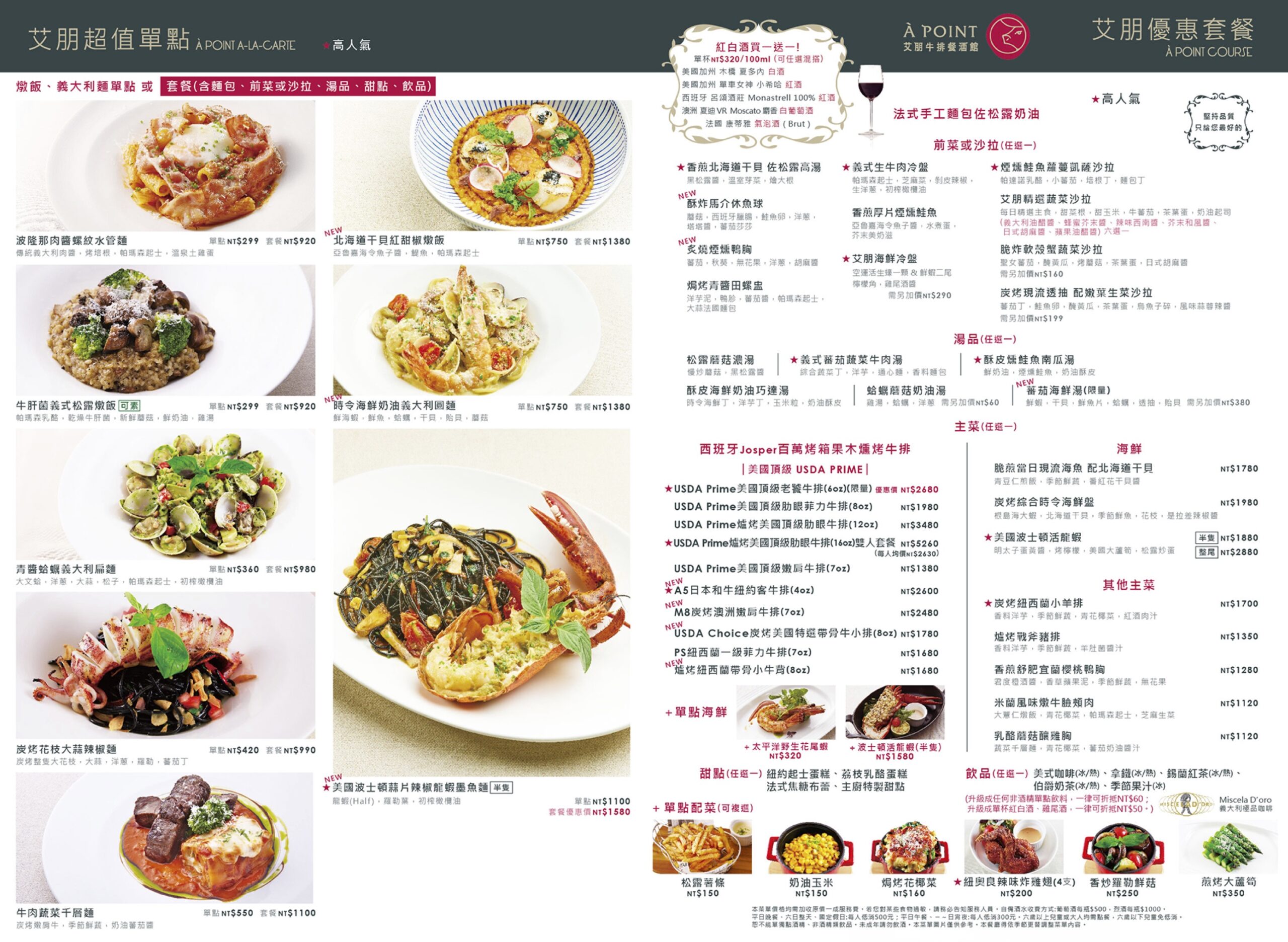原來與台北東區墨賞鐵板燒同個品牌,艾朋牛排餐酒館À Point Steak & Bar,提供套餐或單點之頂級牛排、海鮮、燉飯及義大利麵;另有義式拉花咖啡、有機花茶、特調果汁飲料、雞尾酒。艾朋有午晚餐時段,營業至凌晨3:00,提供給予各位從味蕾開始。