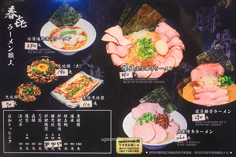 春㐂拉麵職人菜單,圖文並茂,限量拉麵,會在點餐機上,麵條可客製化軟硬度,湯頭濃淡度,湯頭口味有濃厚豚骨和醬油清湯,拉麵湯底口味,有其他小菜和配料可再加點。