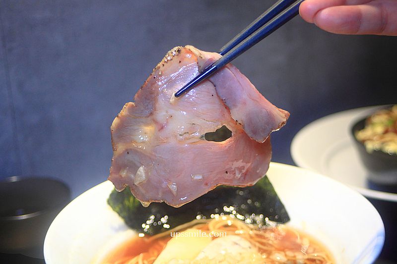 選了醇醬油雞湯拉麵240元,有豬梅花、舒肥雞組合,搭配水蓮,加入洋蔥,後方有片海苔,可見清湯的醬油湯底,還未吃就感受到暖呼呼。