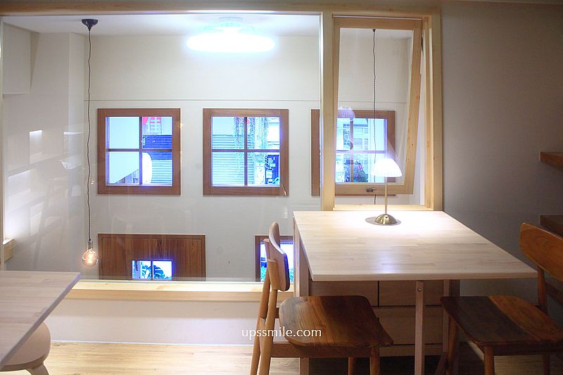 從小樓梯往樓上走,可見大片窗景,營造木質裝潢,暖色系,二樓擺放一張六人座位與一人座位區,二樓空間不大,畢竟是樓中樓空間,可從窗邊位置,往外遠眺。