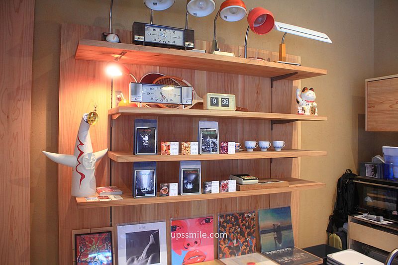 角落可見木板,提供多款咖啡豆,店家除了自家烘焙咖啡豆,只有幾款,也有販售別人家咖啡豆風味豆,印上自己拍攝的攝影照片,當成咖啡豆包裝封面,下方黑膠唱片,透露出喜好品味。