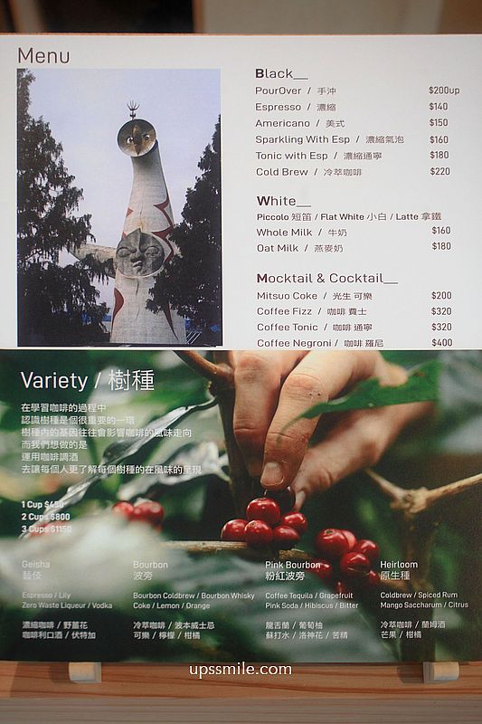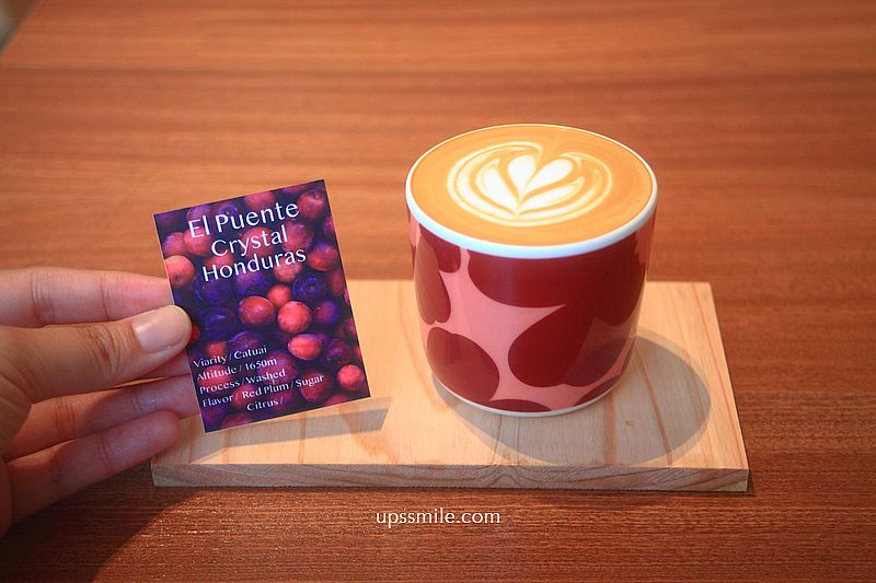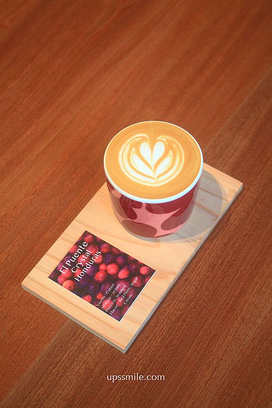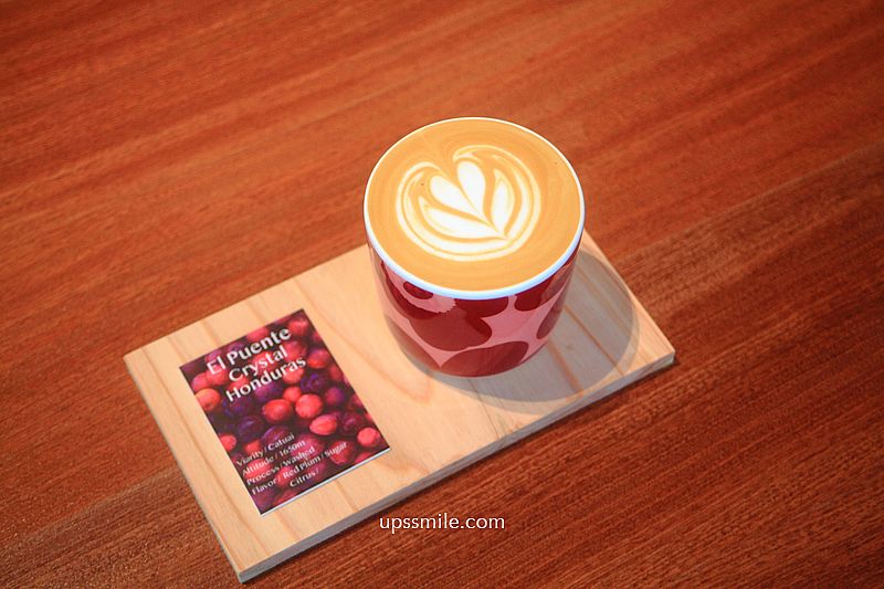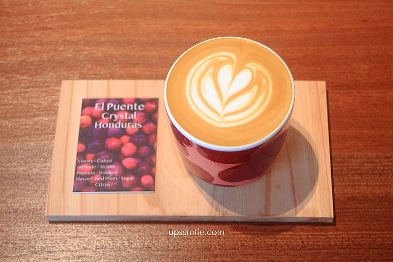 熱拿鐵160元,一片木板擺盤,搭配一張咖啡豆介紹小卡,感受儀式感,喝咖啡變成是件專業的事。