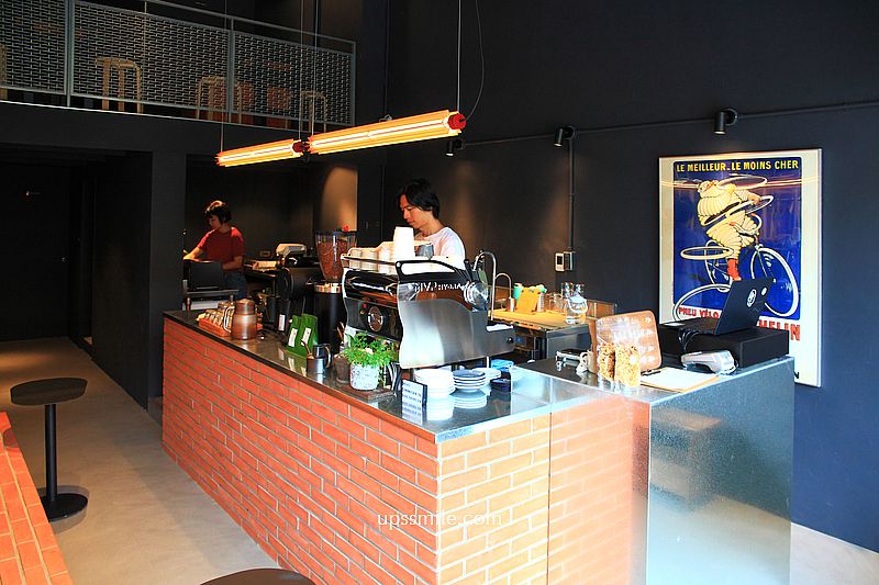 金屬質感結合紅磚的咖啡吧台,小巧精緻,非常有風格。