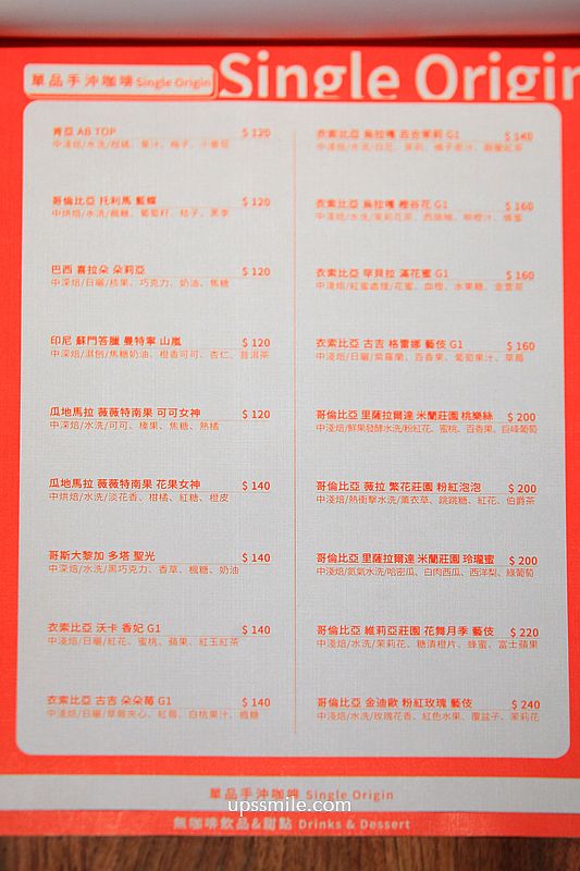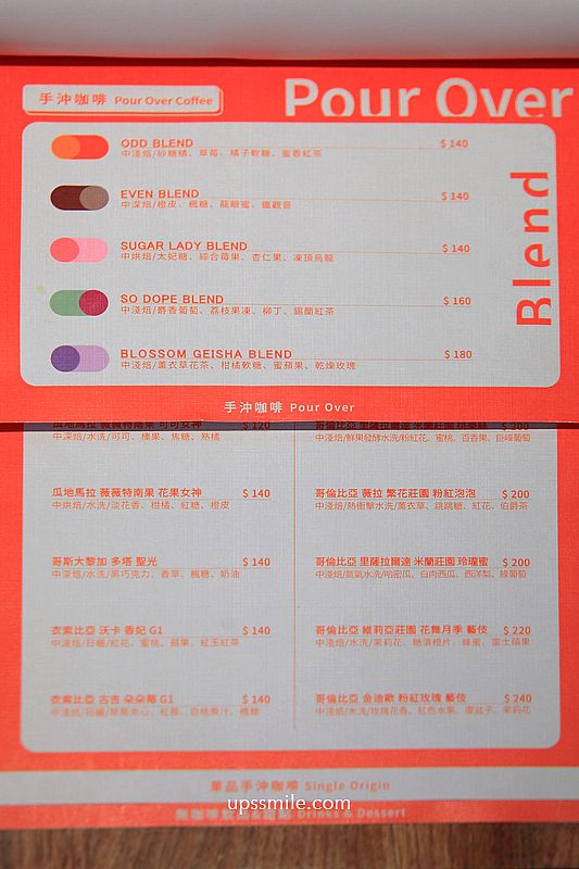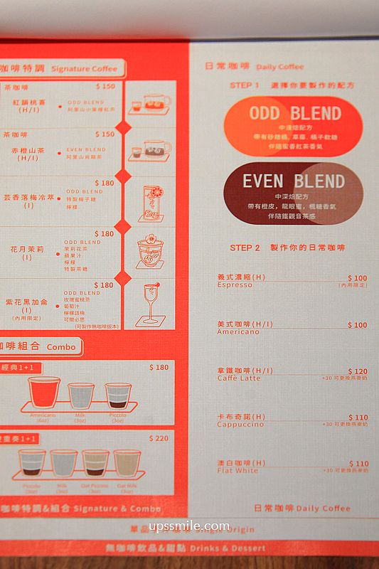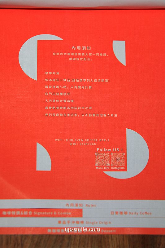 ODD EVEN COFFEE BAR菜單,低消一飲品,內用限時2小時,可內用,也可外帶,提供手沖單品咖啡、甜點、茶、特調咖啡等。
