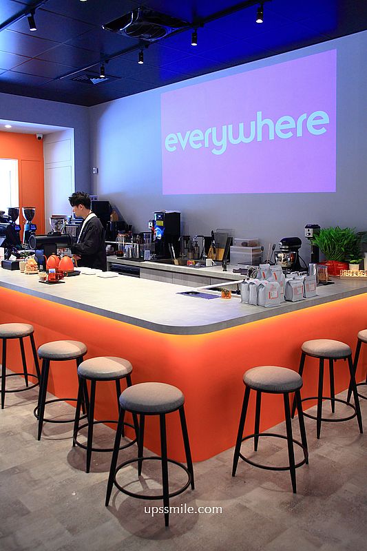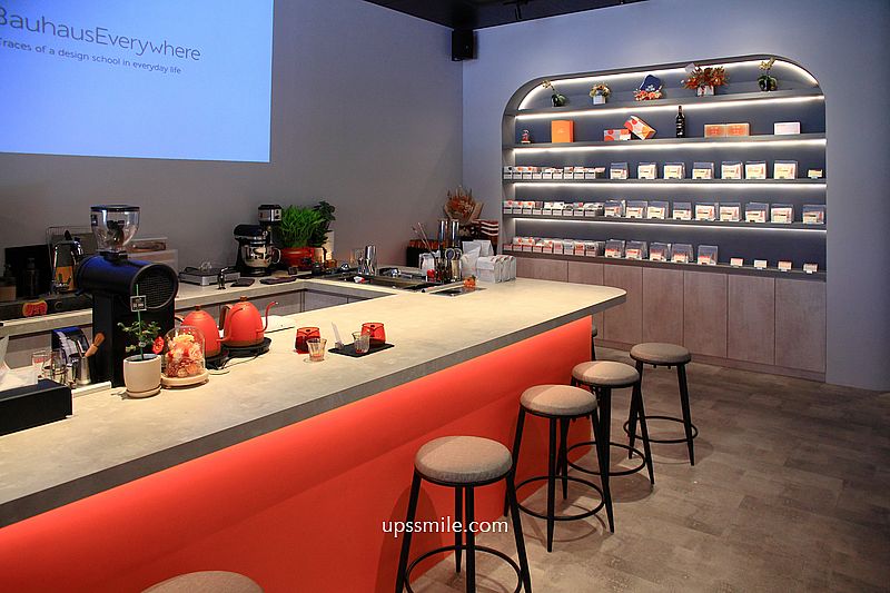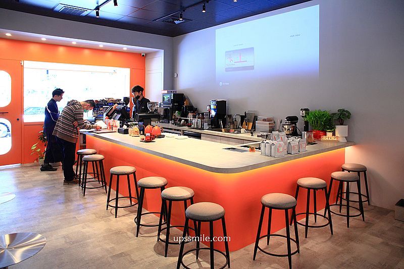 映入眼簾,整個橘色主色系,崇尚包浩斯主義在紅色與黃色之間,選擇橘色作為主色識別,開放式咖啡吧台,宛如咖啡舞台,吧台規劃高腳椅座椅,後方有單人座位區。