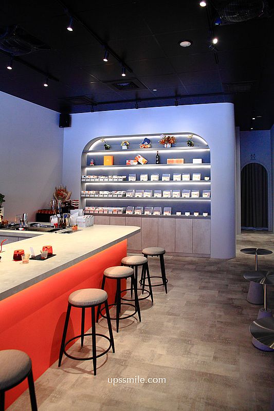 整個橘色咖啡吧台,打上燈光洗牆,很搶眼。