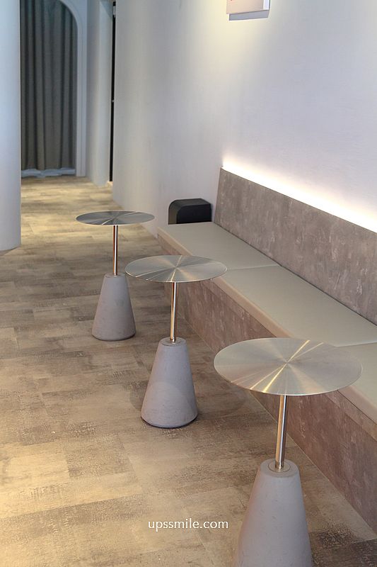 後方水泥灰,開放式沙發座椅,搭配金屬質感小桌,充滿點科技未來感。