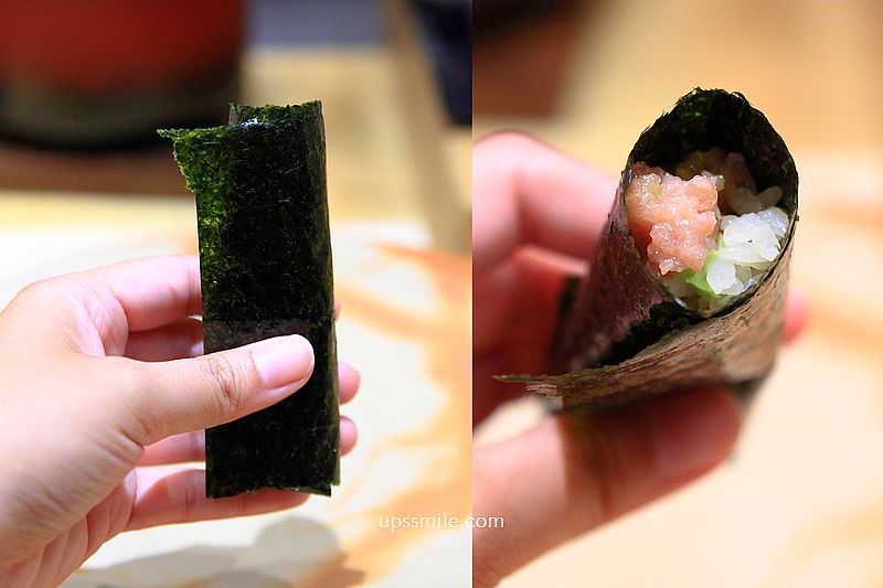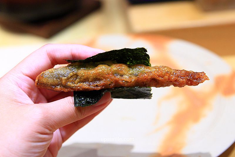 目光魚外觀像是丁香魚,但吃起較像是縮小版的香魚,海苔烤到到脆脆口感,包入炸過的魚,依舊可吃到肉質細膩,油質豐富口感。