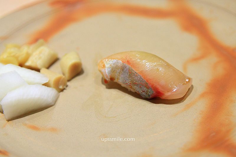 大分縣伊佐木,使用紅醋飯,搭配現磨的靜岡山葵,魚脂肪肥厚、甘甜味一流,可吃到肉質紮實、彈性好,有鮮香四溢的口感而聞名。