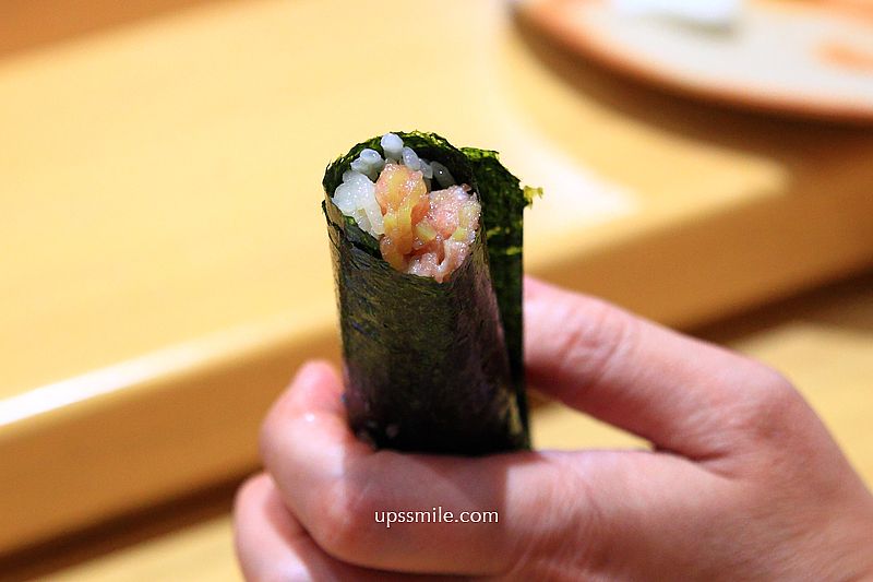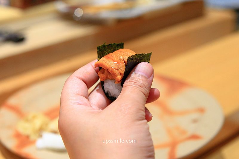 北海道海膽,搭配烤過酥脆的海苔,包入海膽,一整個用料下重本,一入口鮮味十足還奶香味,這裡米飯好吃,使用長野越光米,本身米的糖度高,醋味明顯,造就米飯好吃關鍵。