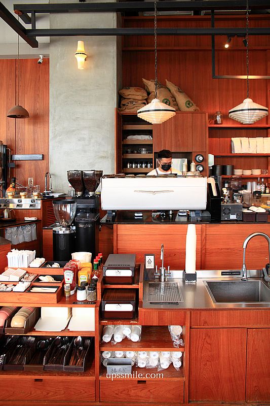 木質裝潢吧台,溫潤大地色系,使用勞斯萊斯咖啡機等級,白色的,超美的。