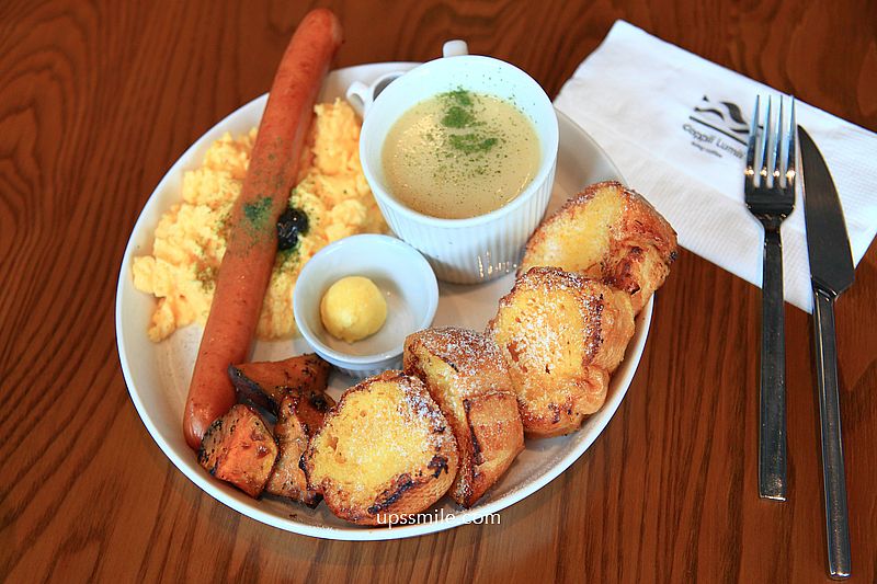 小法國套餐組合348元,漲價了,之前318元,一整個圓盤擺盤,非常豐富,早午餐裡有暖和濃湯、法國吐司、松露金黃嫩蛋、德腸和地瓜。炒蛋,炒蛋非常軟嫩,德國香腸非常脆彈,這天濃湯是玉米濃湯,非常濃郁的濃湯,吃完有飽足感,光看很美味,食指大動。