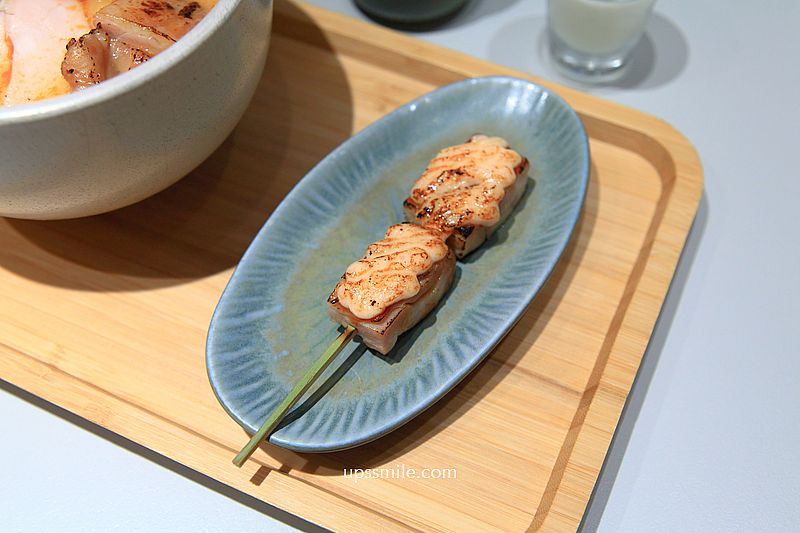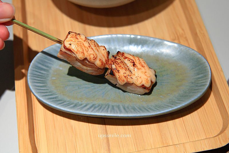 多款炙燒燒鳥,如燒蔥鹽雞腿、明太子雞腿等,不只提升香氣,層次更為豐富,這天選擇明太子雞腿,明太子醬汁在上頭,讓雞腿肉增添風味,光看烤物料理有水準。