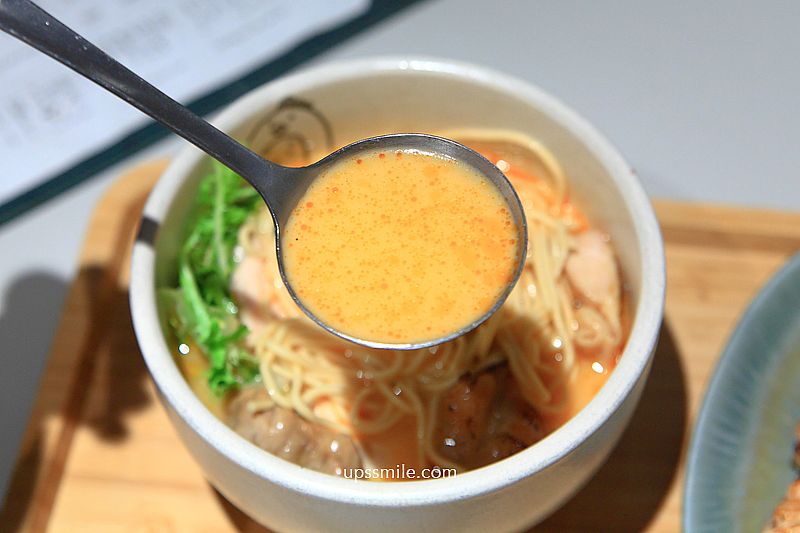 一整碗橘紅色湯底,胃口大開,湯頭鮮美,以全雞熬煮為湯底,將法式料理作法注入每一碗拉麵中,雞白湯加入海鮮海膽魚子,兩種組合,造就甘甜湯底,鮮味被逼出,好好喝,很暖胃。
