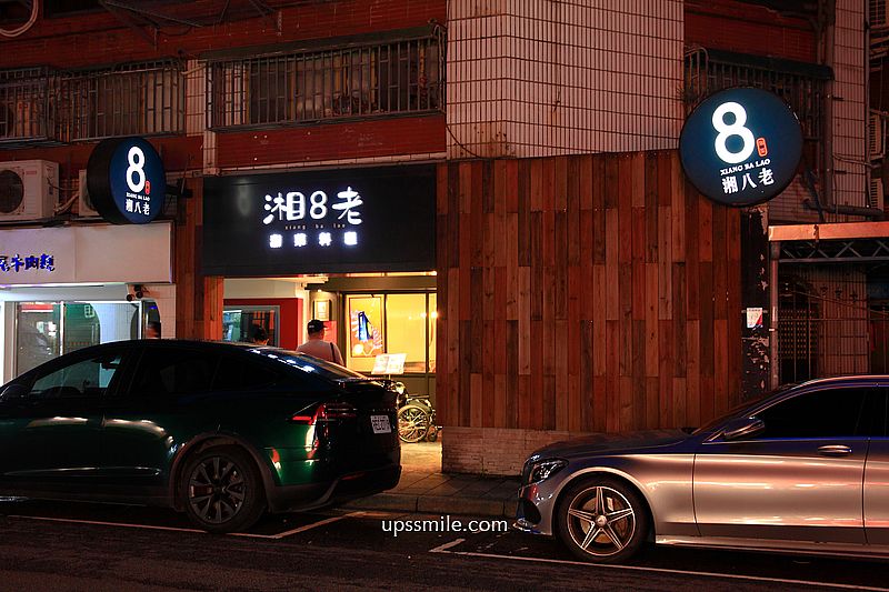湘八老位於台北市大安區安和路二段74巷,門口外觀,夜晚夜幕低垂,有設計一片木質裝潢,掛上小小招牌,黑底打上白色光,傳承湘菜料理,低調中卻顯搶眼。