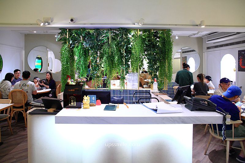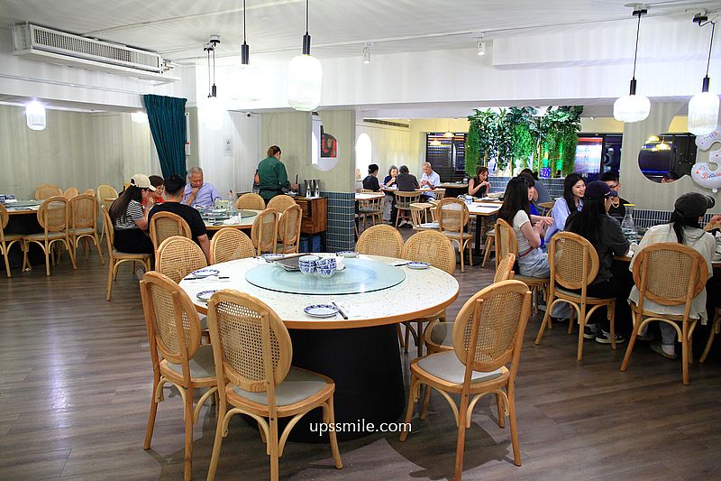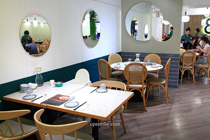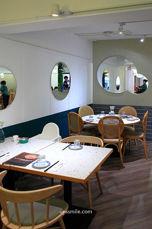 映入眼簾,前方規劃一個發亮的純白櫃檯,綠色植栽垂掛,打造很新穎,文青風裝潢餐廳,木質地板,大量圓桌與方桌,搭配木質韓系編織椅,整個設計很清新,少了復古懷舊那種沈重裝潢,這樣氛圍讓年輕人更容易想聚會朝聖。