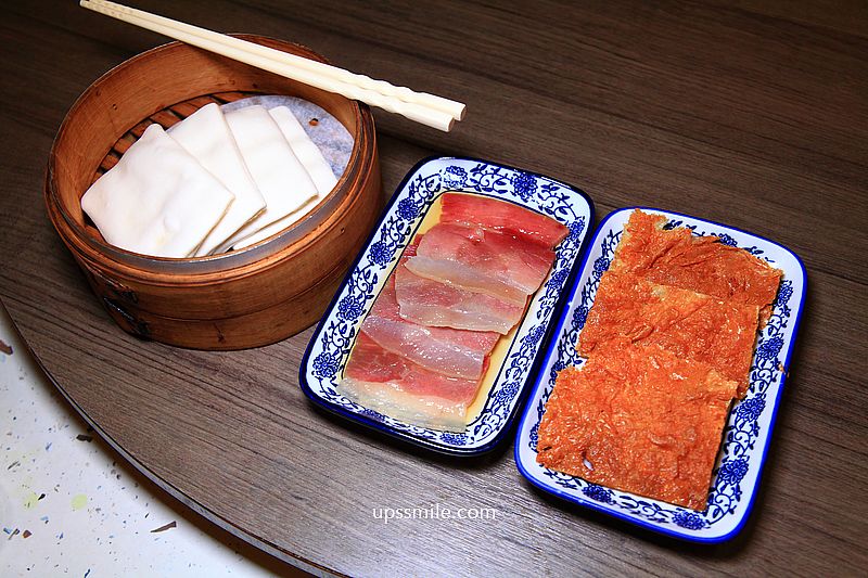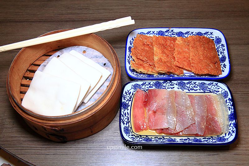 嚴選台灣本土溫體豬,採火腿中間最質優的腱心肉部分切成薄片後,灑上棉糖以中和鹹味,接著包上耐熱的玻璃紙,製成蜜汁火腿,以糖蜜和秘方煮製,加入酥酥脆脆的烤方,使用豆腐皮和著蝦米、火腿蓉,裹上麵粉酥炸製成烤素方,熱騰騰的麵香餅皮,絕配組合。