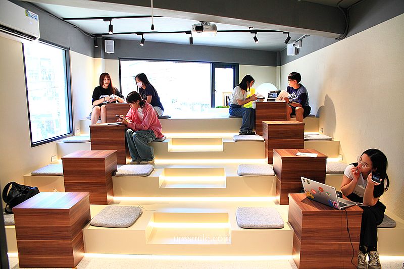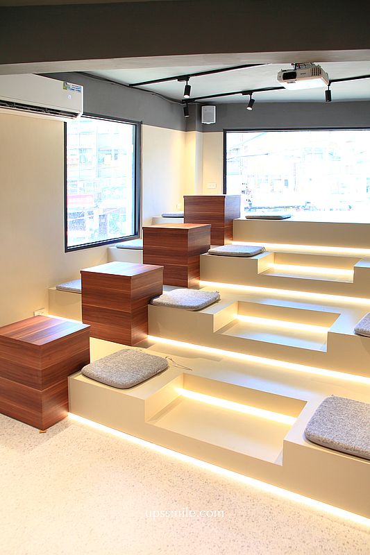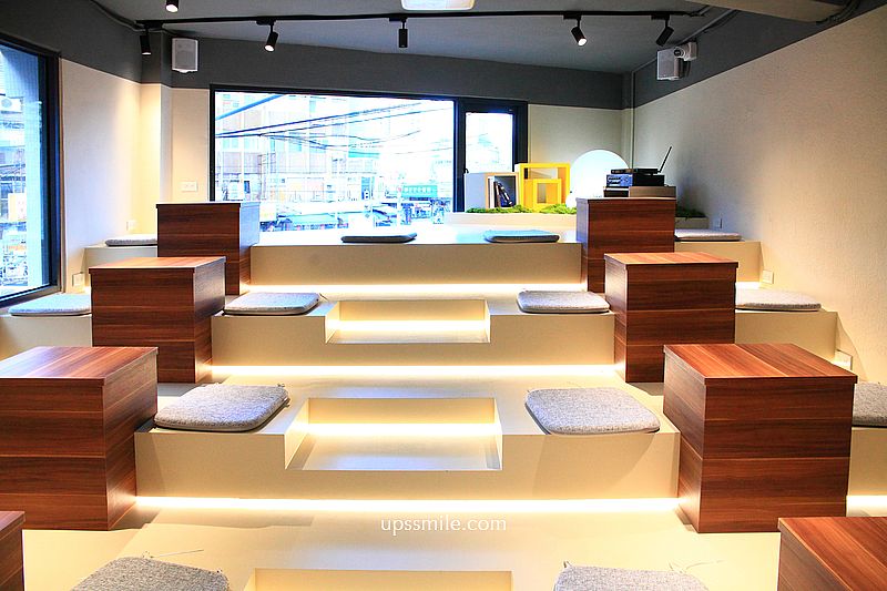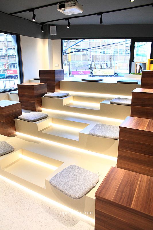 走上二樓,大片窗景,一邊是階梯式座位,小木方桌,與地板貼齊,坐墊直接放在階梯上,適合兩人座位。