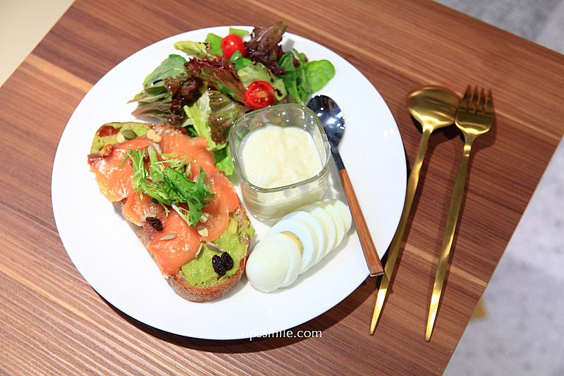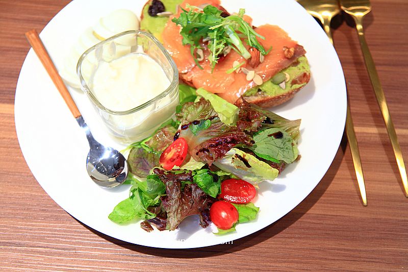 煙燻酪梨早餐酸種麵包310元,早餐盤很豐富,一片酸種吐司鋪上酪梨與煙燻鮭魚,搭配好吃的水果優格讓人意外的好吃,附上水煮蛋顯得有點廉價,搭配油醋沙拉組合,很豐盛。