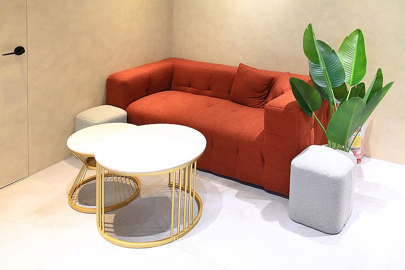 一樓樓梯口轉角口,擺放一張雙人沙發區,白色的子母小桌。
