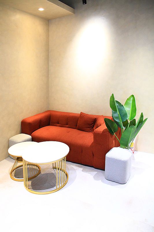 另邊提供兩人座位區,水磨石子地板,提供六張雙人座位區,小巧精緻空間,採光明亮空間。