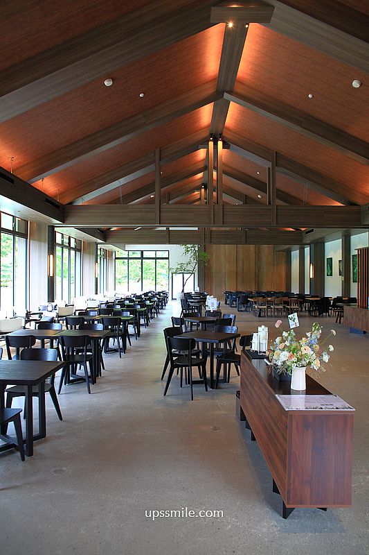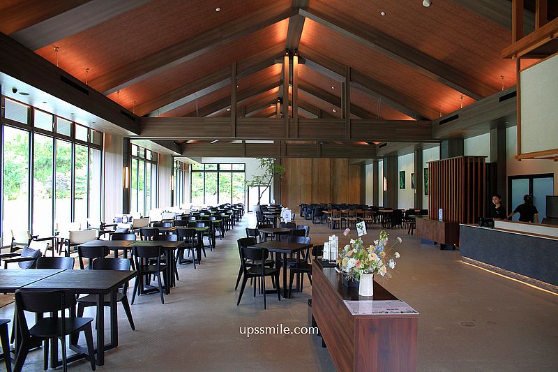 映入眼簾,從黑色日式建築落地玻璃屋入內,會被眼前震撼,挑高三角屋頂,通透空間,分成好幾區座位,靠窗邊的四人沙發座位,以及中間四人木桌搭配北歐風木椅,整個質感很好。