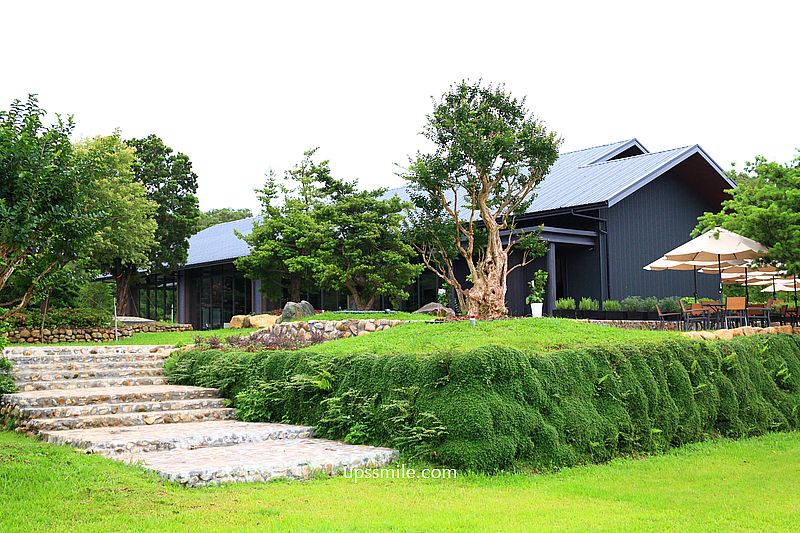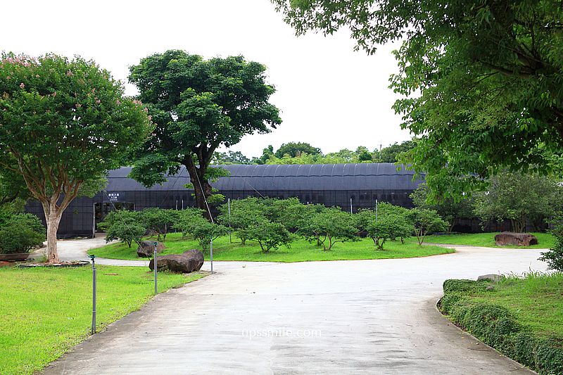 園區內,最後方單獨一空間,綠意盎然庭院造景,可見單獨一間黑色建築,淡水鹿角蕨園區。