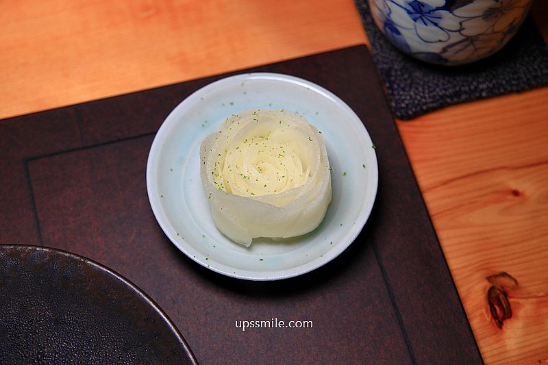 柚子蘿蔔,醃漬處理,宛如綻放的玫瑰,切成薄片的蘿蔔,脆甜可口,柚香開胃。