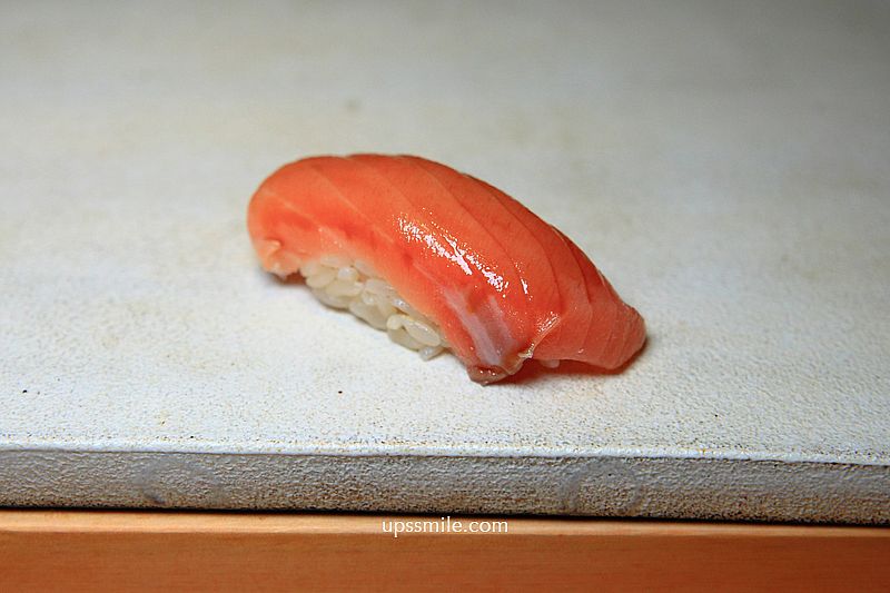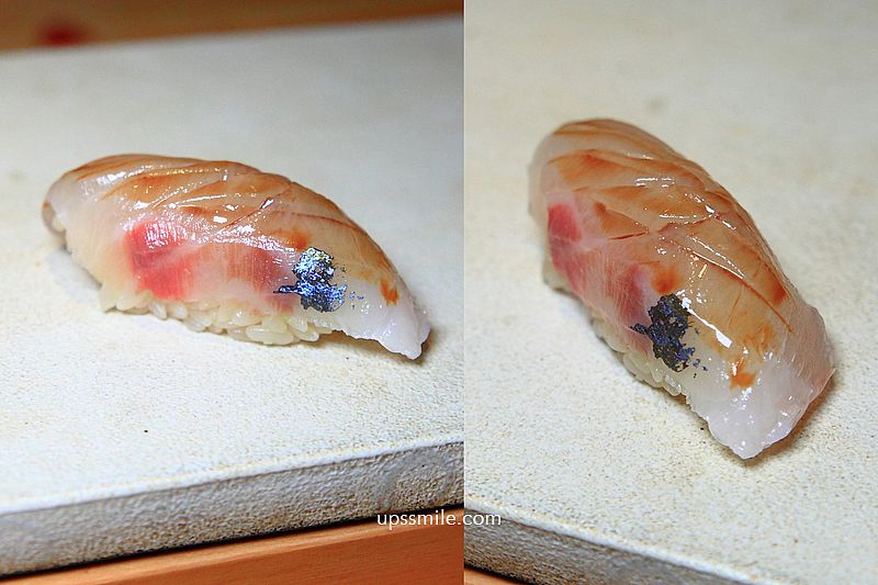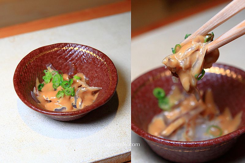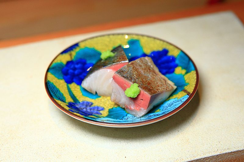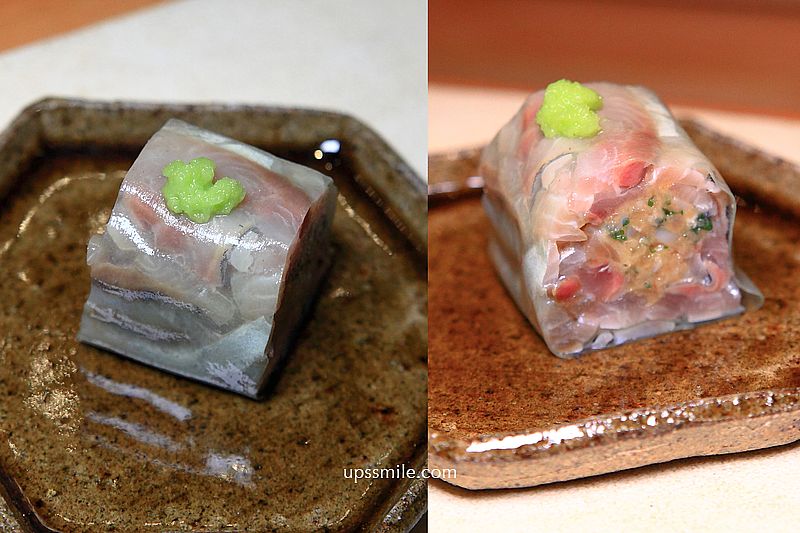 竹莢魚與昆布芯組合,包入少見的鯊魚軟骨,增添口感,一整捲宛如壽司果凍外觀,把竹莢魚切成薄片,考驗刀工,昆布中間較柔軟的部分,通常指昆布葉片的中心部位,加入鮪魚與鯊魚軟骨,軟嫩細緻質感,好鮮美。