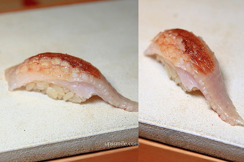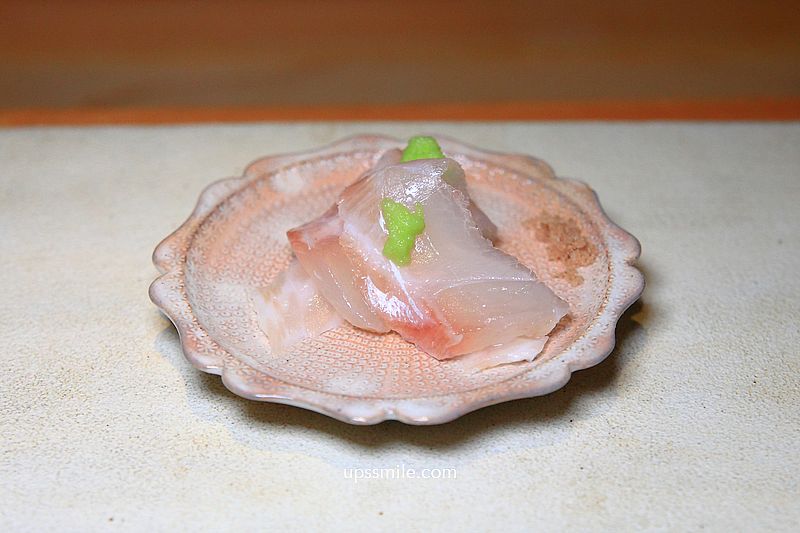 白馬頭搭無花果,魚鱗處理,宛如酥脆外衣,肉質細嫩、油脂豐富、入口即化,搭配無花果吃,巧妙吃法,近年來日料主廚很慣用這兩種食材搭配組合。