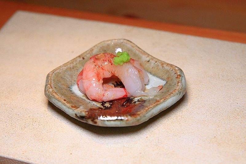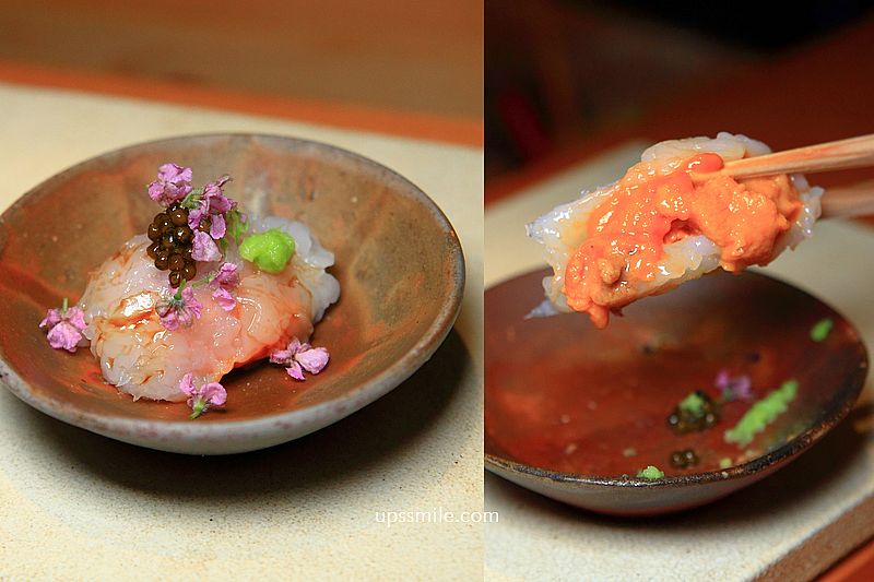 北海道甜蝦與蝦膏,以昆布醃漬三天熟成後,以蝦膏味噌和現磨山葵,拿蝦殼磨成粉,蝦膏融入菜餚,兩種不同蝦風味,可吃到蝦的鮮美,味道濃郁,愛吃蝦的老饕,讚不絕口。