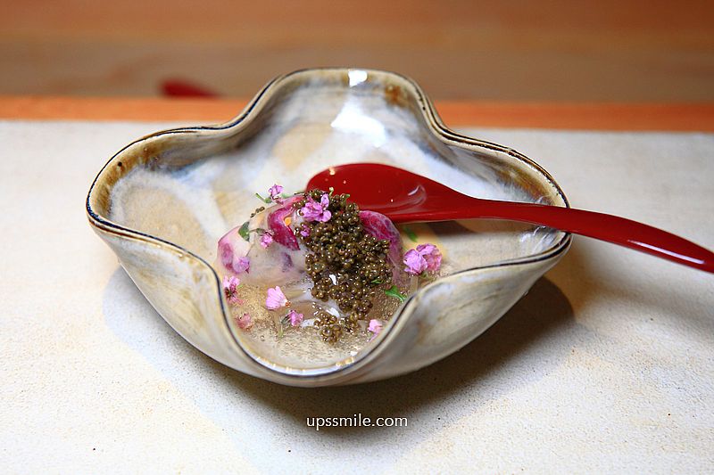 北海道松葉蟹蟹肉蟹膏、蓴菜,用芥末味增調味,搭配魚子醬,紫蘇花,粉嫩色系,很有春意,挑選這種宛如貝殼曲線的盤裝,顯得更美味。