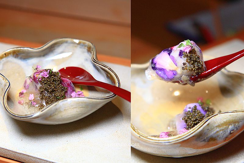 墨魚切細絲,包入海膽與紫蘇花,上頭放上重口味的魚子醬,海膽份量給得多,獨特口感與鮮美風味,讓整個看似普通的墨魚,多了豐富性,魚子醬本身香醇,甜美宜人,因此享有「海中黑鑽石」的美譽,紫蘇清香增添豐富層次。