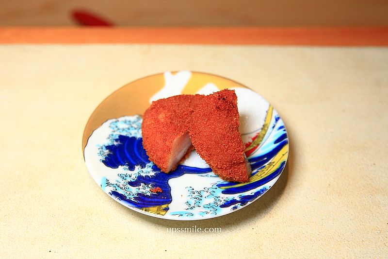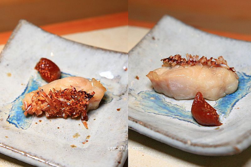 北海道烤干貝裏上烏魚子炙燒,很費功夫的一道料理,烏魚子得先磨成粉狀,包覆干貝外層,可吃到鹹甜層次,外層微焦香脆,內裡則保留干貝的鮮甜與柔嫩Q口感,好鮮美。
