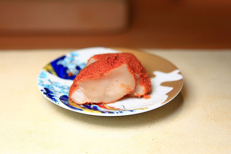 鹿兒島紅甘,來自鹿兒島產的紅甘魚,又稱杜氏鰤,高級食用魚,吃下一口肉質細嫩又甘甜,油脂豐富,適合多種料理方式,製作成握壽司,好美味。