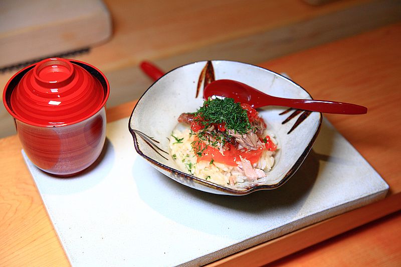 鮨荻 sushi ogi無菜單料理,享用每人5500元+10%服務費,套餐可直接吃到冷食生魚片、握壽司、中熱食、熟食等不同食材呈現,不是走傳統生冷食材或握壽司多組合,感受中熟食與熟食各半,呼應現代人飲食不吃太多米飯與澱粉,享用正統廚藝演繹的日本料理,一套餐吃下來,菜品道數多達25道上下,跳脫傳統台灣日料無菜單少份量呈現,證明台籍日料師傅廚藝不會輸給日本師傅,在板前享用Omakase套餐。