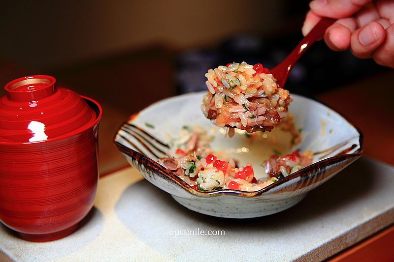 黑鮪魚胸鰭飯,以黑鮪魚胸鮨肉絲搭配鮭魚卵,加入四國青海苔提味,中間可見一個半熟漬蛋黃,建議把蛋黃拌開再食用,一款充滿繽紛色彩的醋飯。